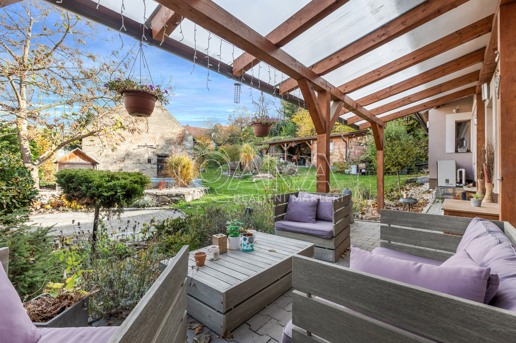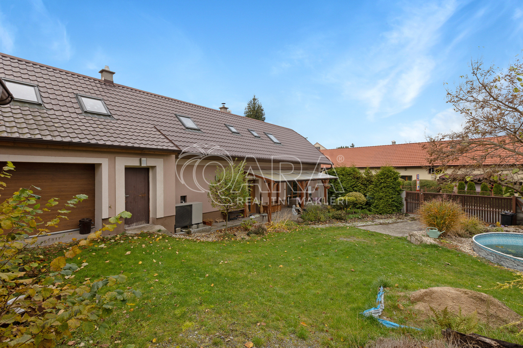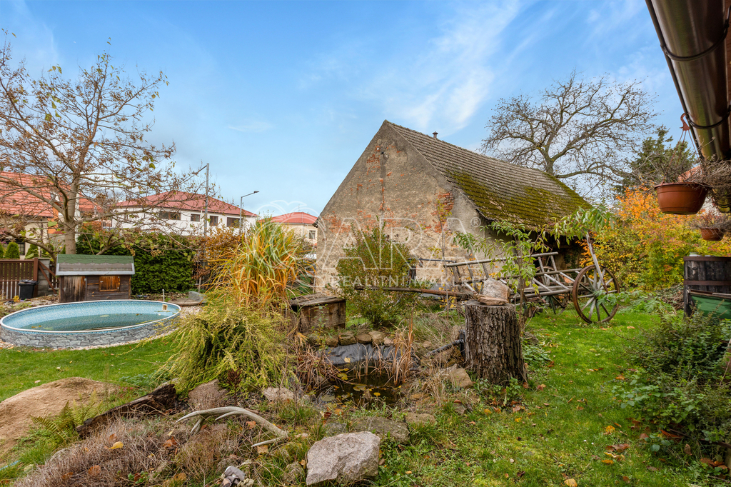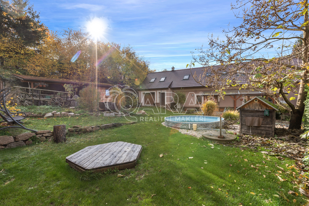 Zahrada o rozloze 975 m² disponuje pergolou, vinným sklípkem, bazénem a stodolou. Bazén má filtraci a tepelné čerpadlo, studna elektrické čerpadlo.