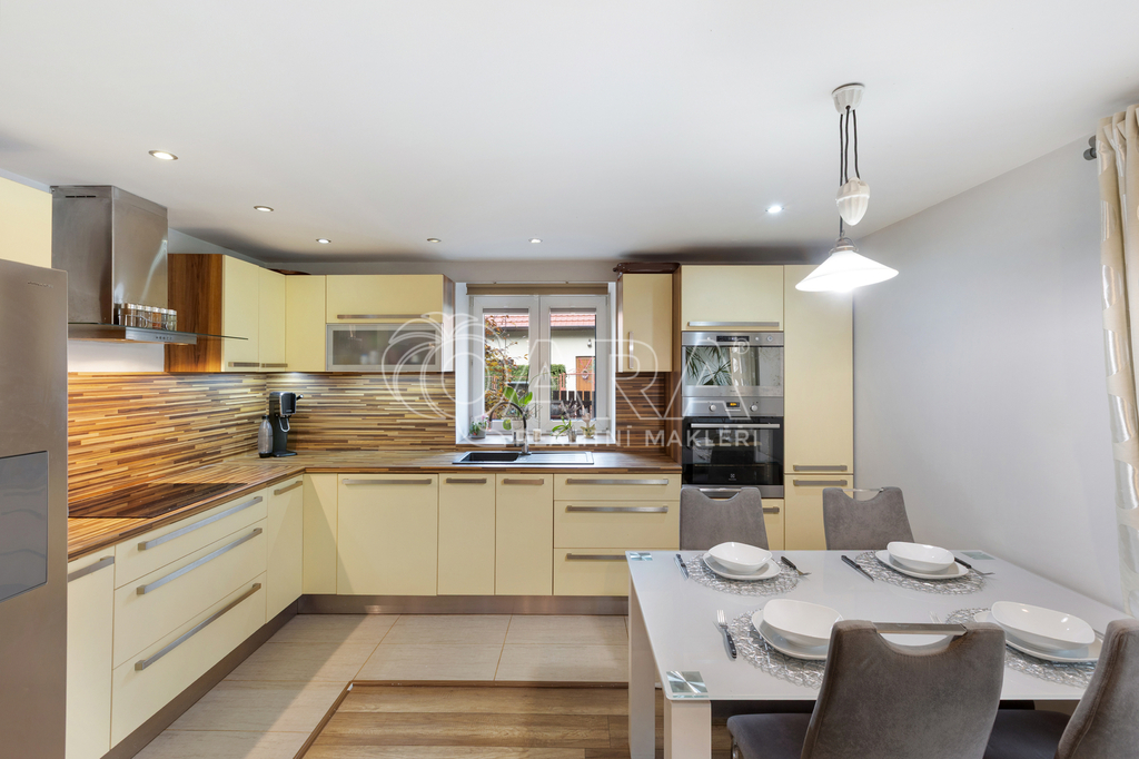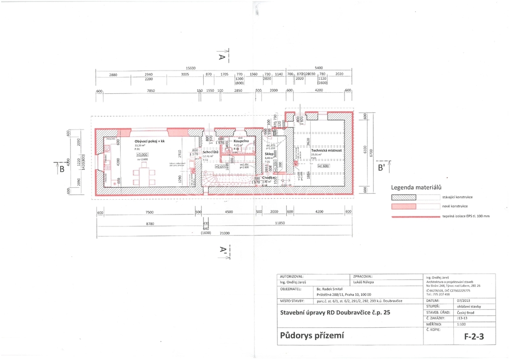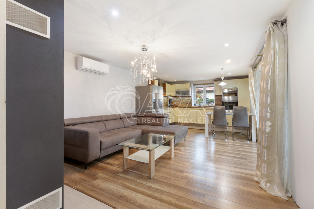 Přízemí: Kuchyně propojená s obývacím pokojem, koupelna s WC a pračkou, chodba, garáž s přímým vstupem do domu a technická místnost. Venkovní terasa s francouzským oknem.